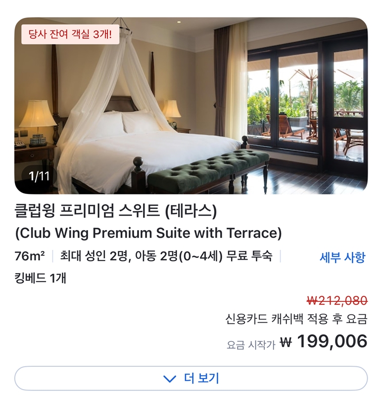 라 시에스타와 베이 리조트 중 하나를 빼야 하는데, 라 시에스타의 경우에는 최상위 등급 룸으로 올라가도 가격 부담이 크지 않았고요.