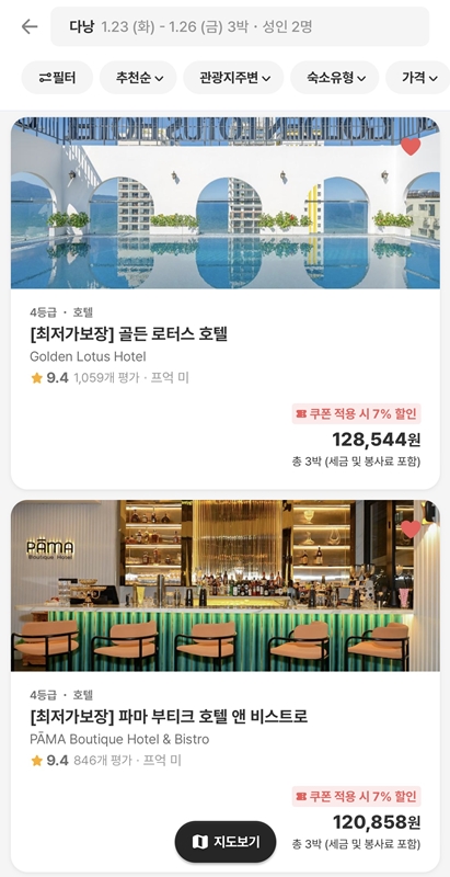 금액도 부가세 포함된 총가격으로 표시되고 지도 보기도 아고다 대비 편하게 구성되어 있어서 좋습니다.