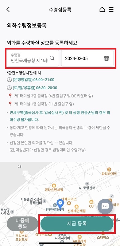 마지막으로 지금 등록하시면 바로 환전 처리가 되고, 공항에서 찾으시면 끝.