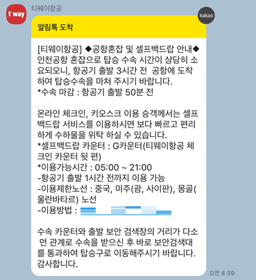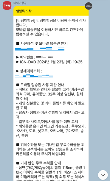 저는 티웨이에서 전날 사전 좌석 지정 및 모바일 체크인 안내 카톡을 받아서 모바일 탑승권을 발권했습니다.