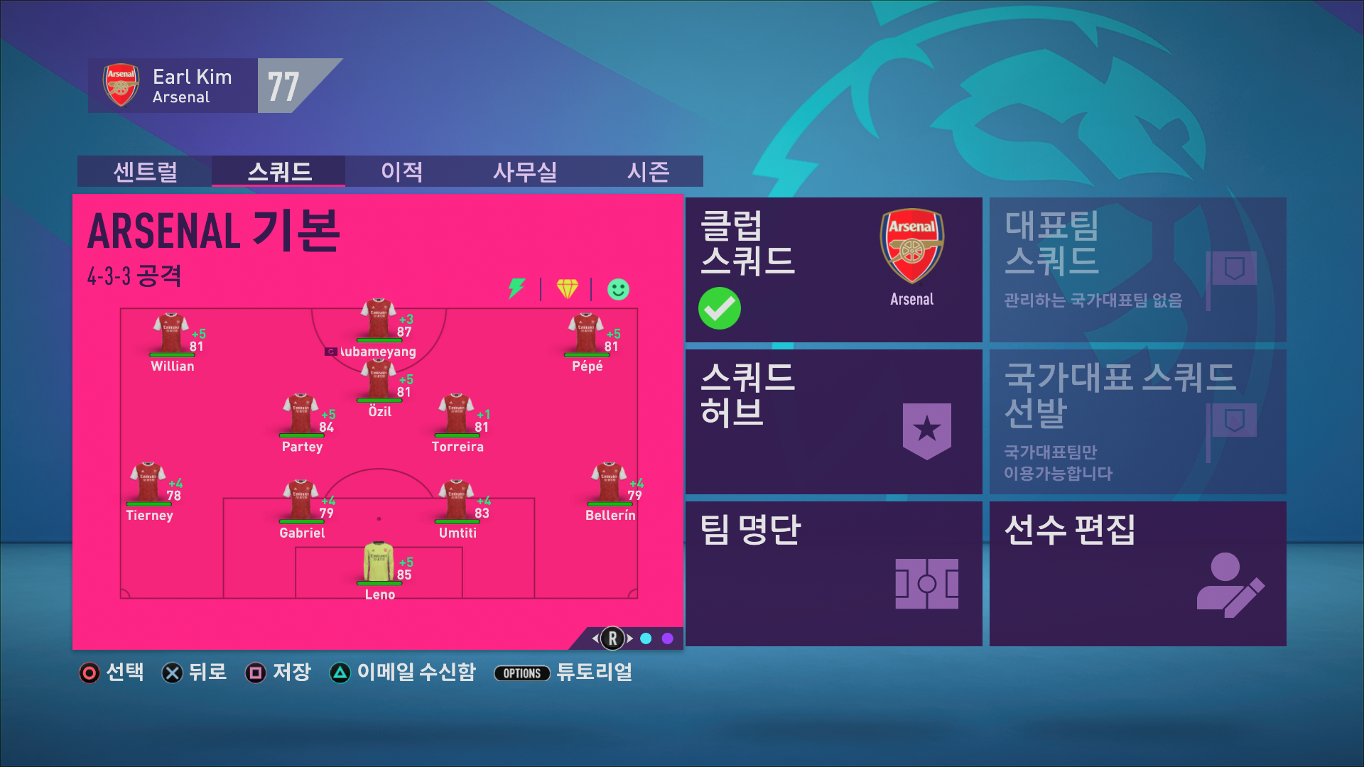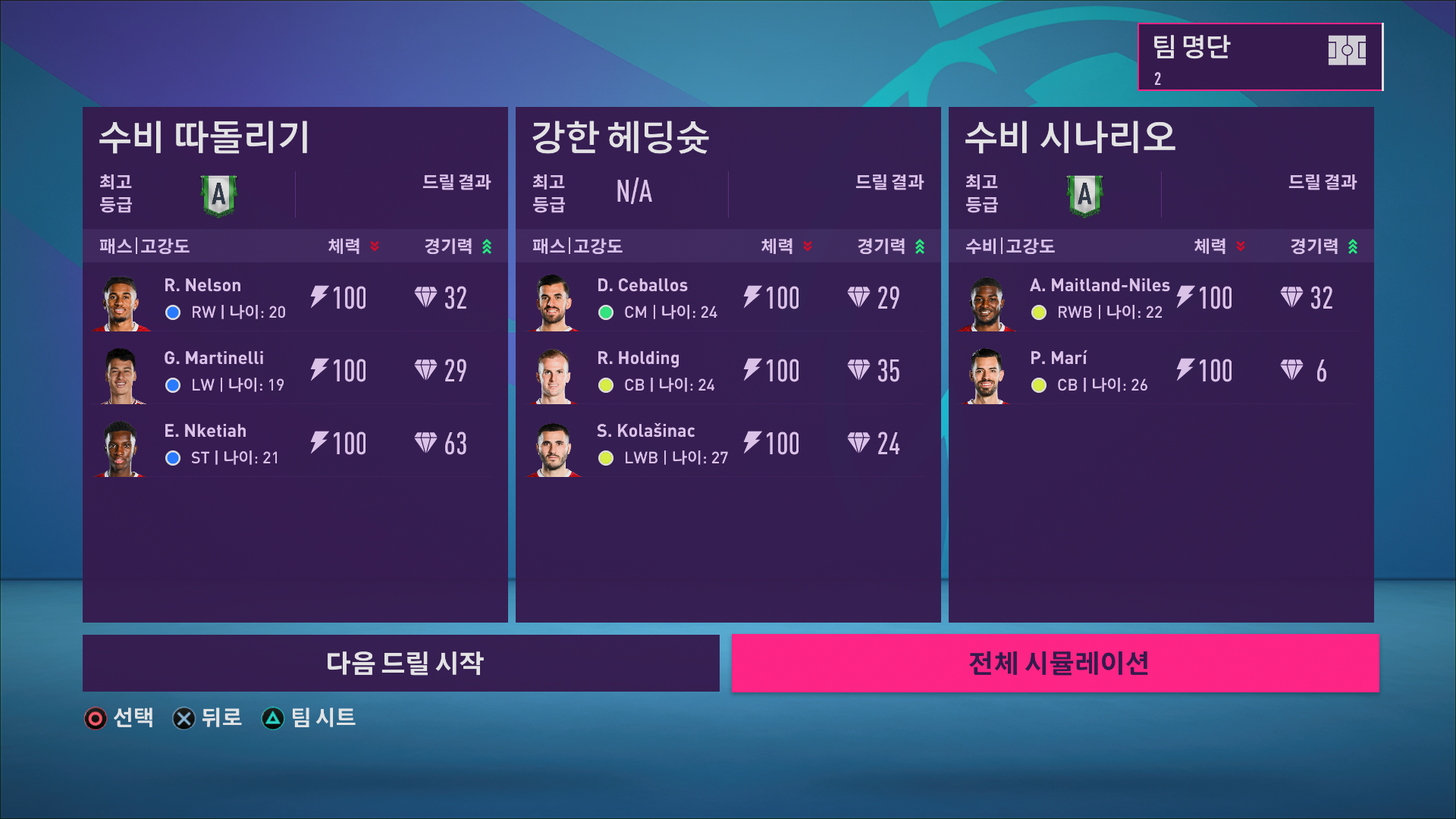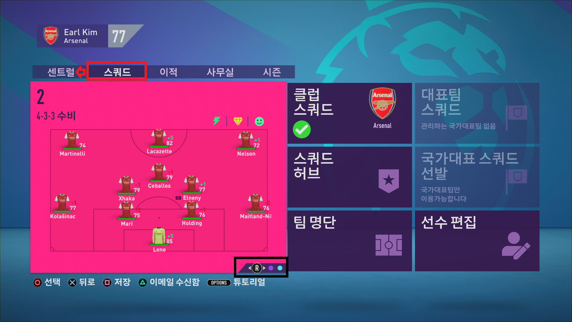 현재의 스쿼드 메뉴에서 스쿼드를 사진과 같이 2군으로 세팅해놓고(R3, 오른쪽 아날로그로 조정) 다시 센트럴 메뉴로 넘어가 훈련으로 들어가 보겠습니다.