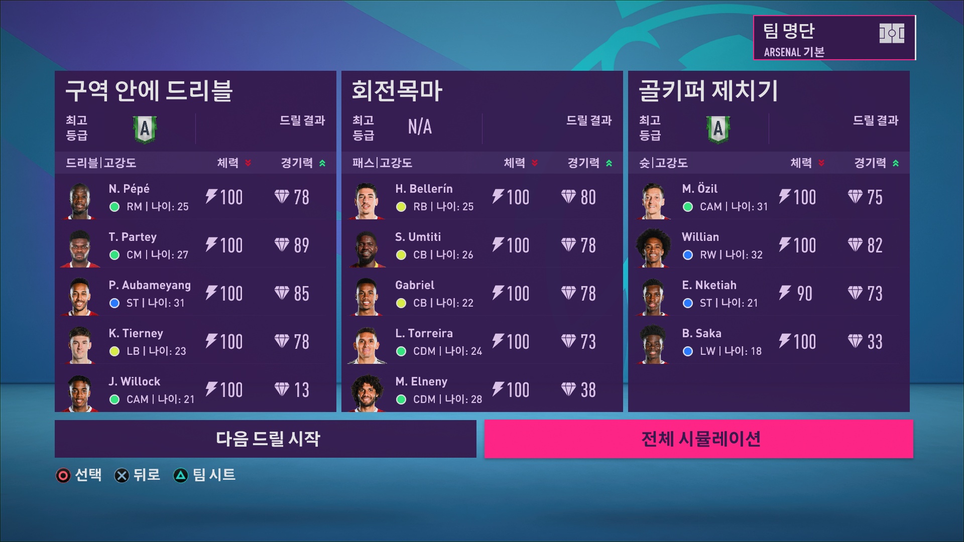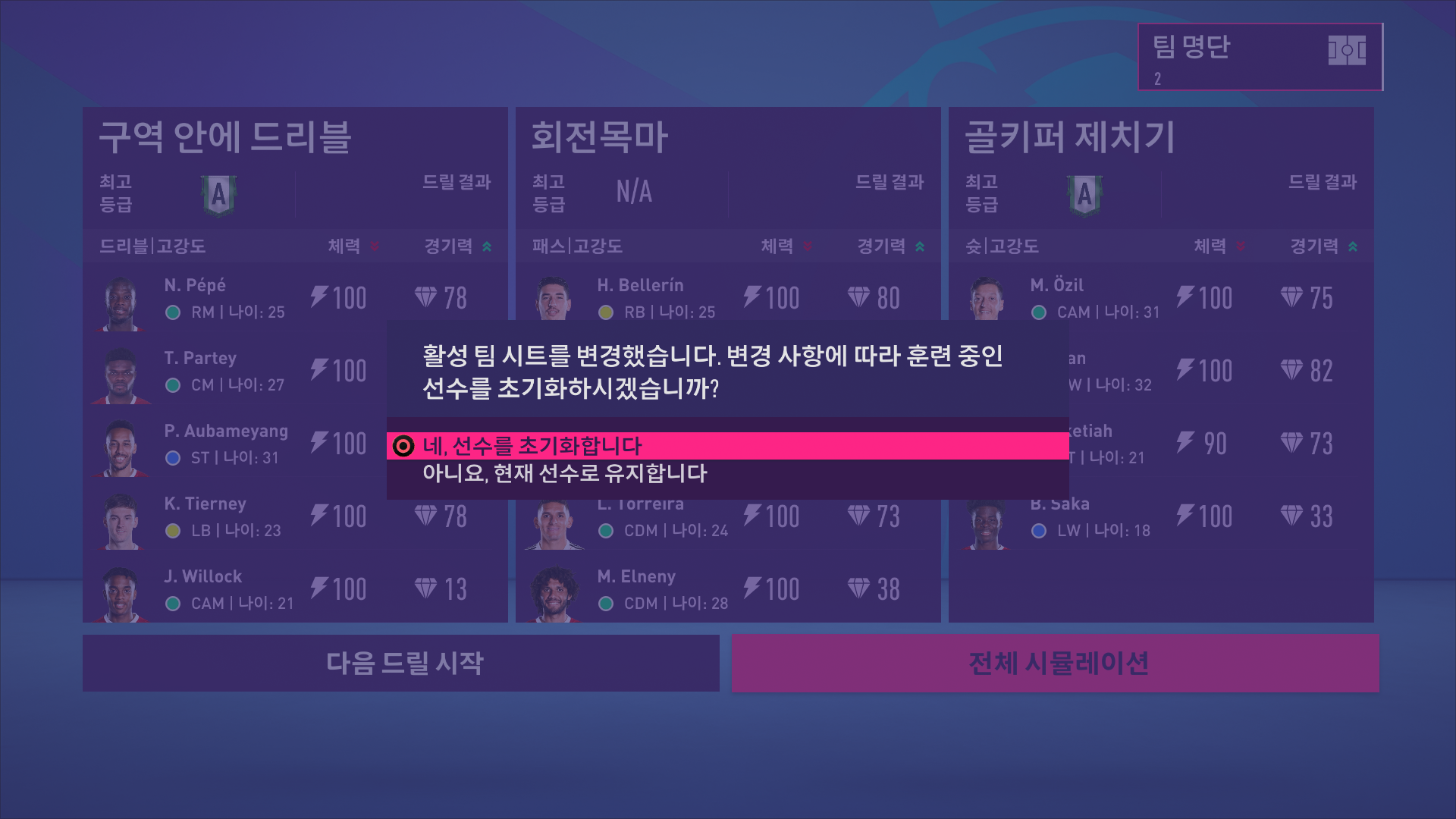 내가 잘하고 못하는 훈련의 구분과 인원수를 고려해서 세팅을 상황에 따라 개입해서 설정하신다면 더 효율적인 경기력 관리가 가능하겠습니다.