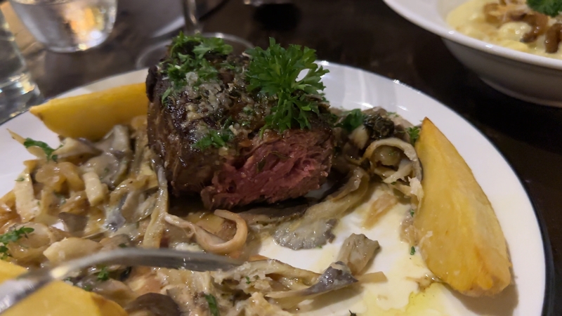 간도 잘 되어 있고 바닥에 깔려 있는 버섯과 소스도 고기와 잘 어울립니다.
