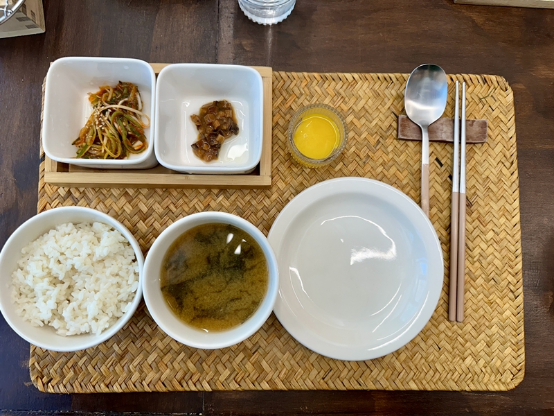 파절임, 버섯와사비, 생계란 노른자, 장국이 나와요.