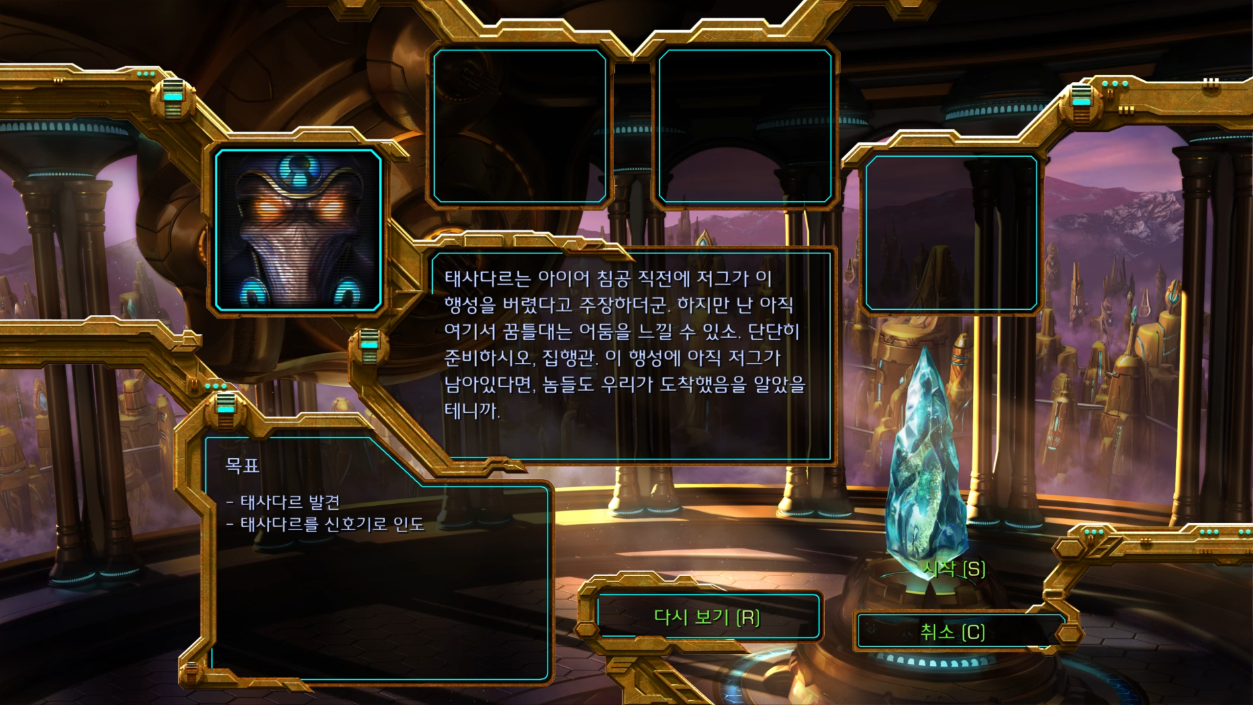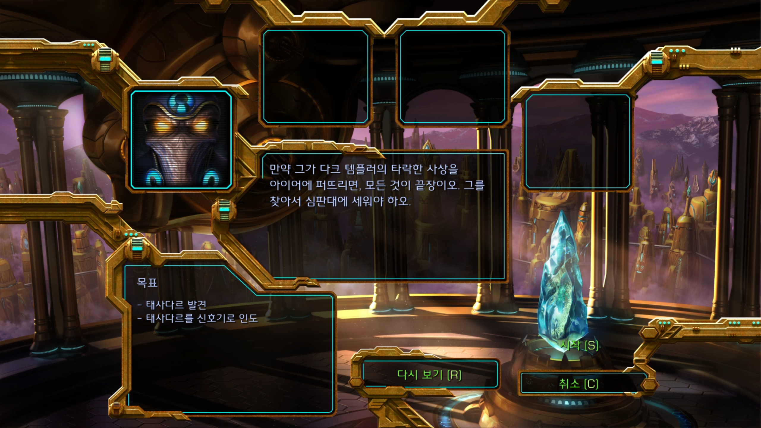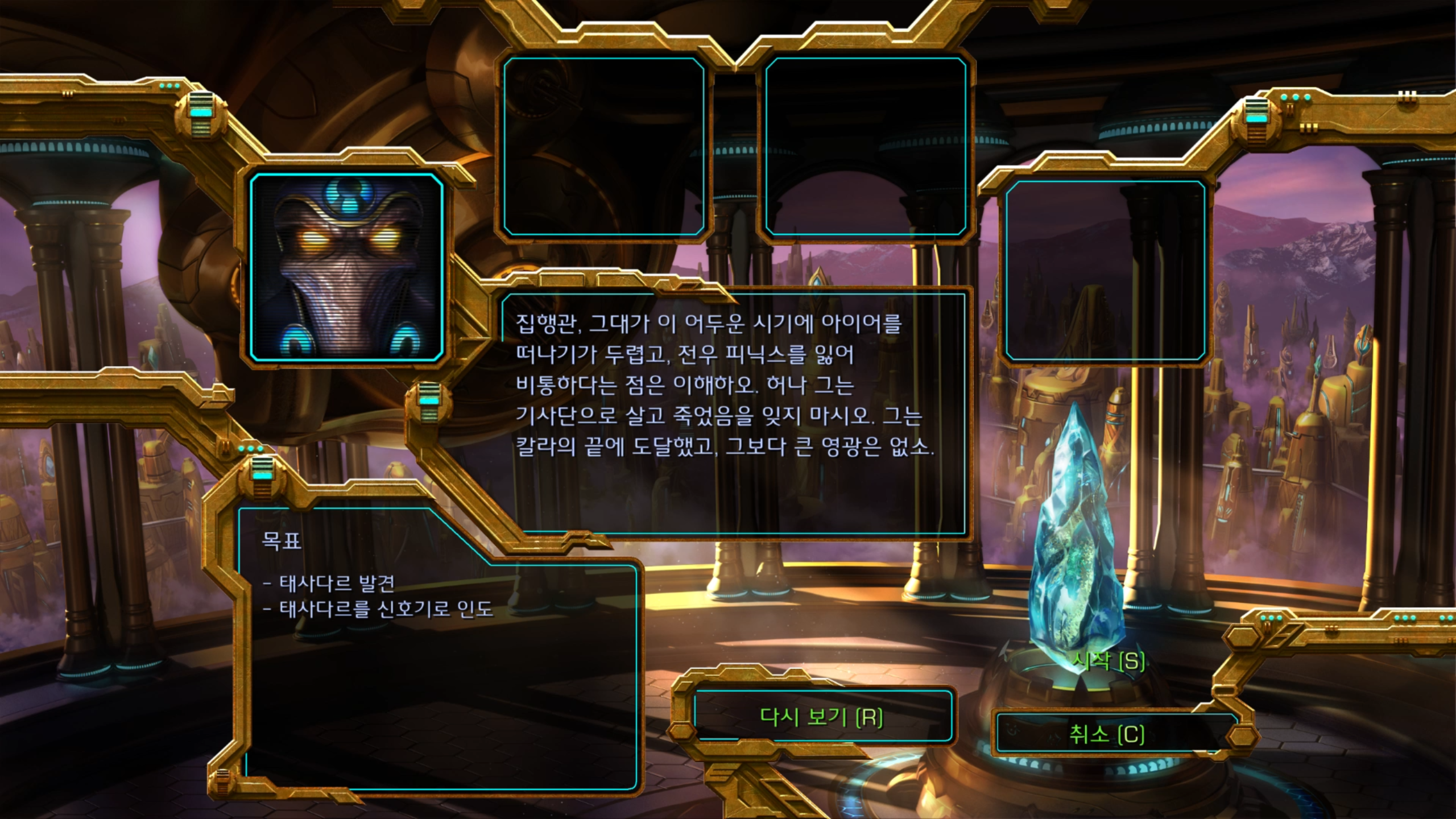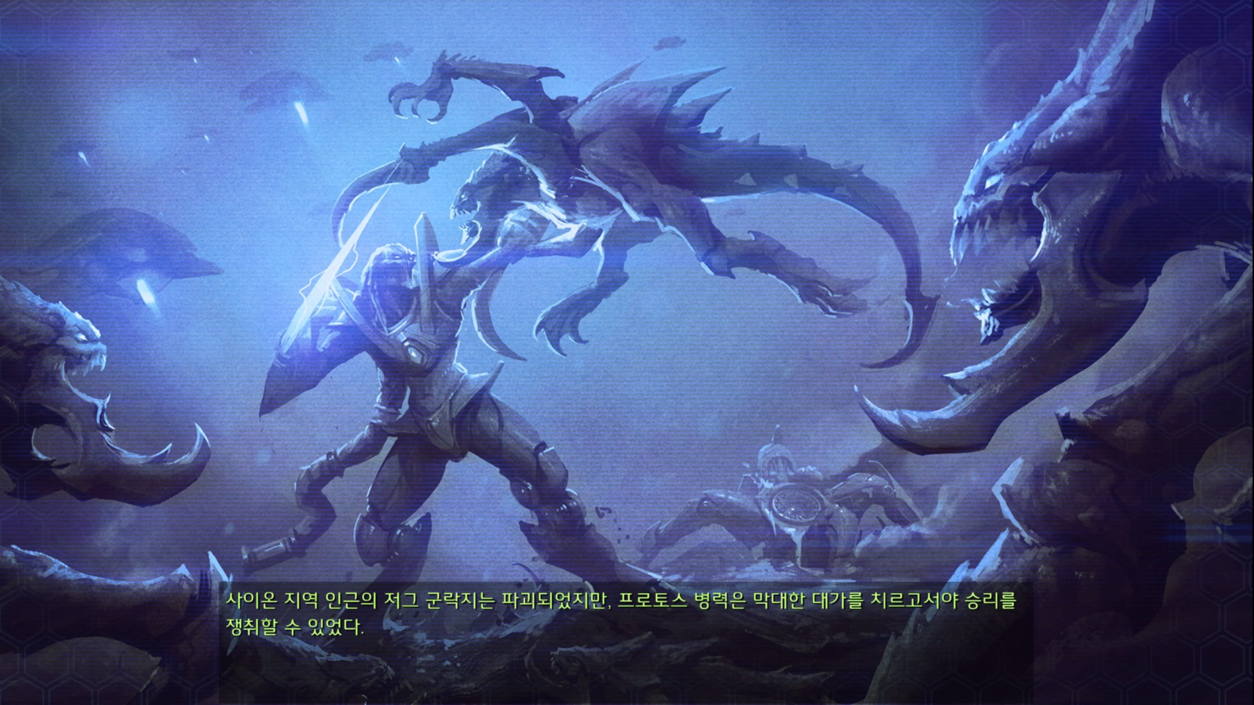 저번 미션에 대한 리뷰로 시작합니다. 사이온 지역을 탈환하는 데 성공했지만 그만큼 막대한 피해를 입은 프로토스.