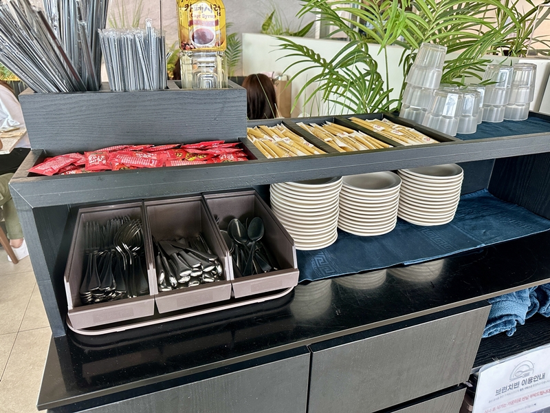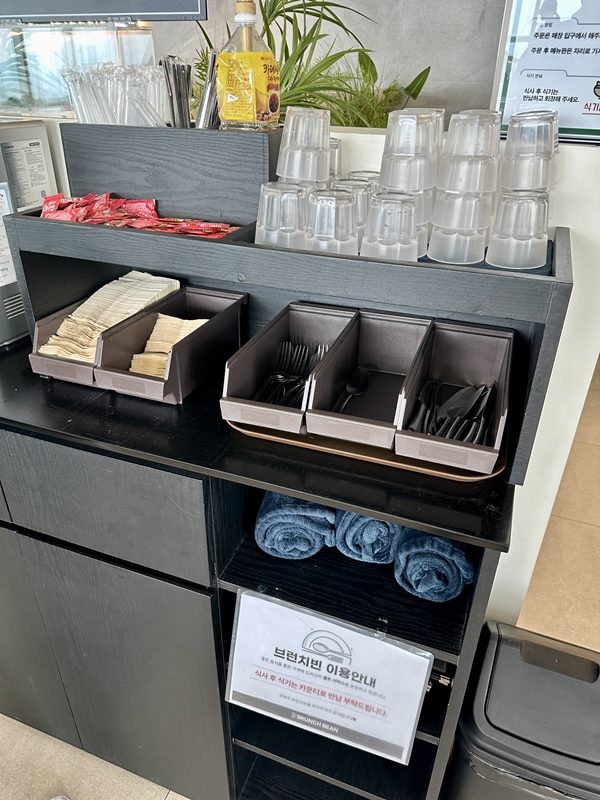 중앙의 셀프바에 각종 식기류와 소스등이 있으니 취향껏 챙기시면 되겠습니다.