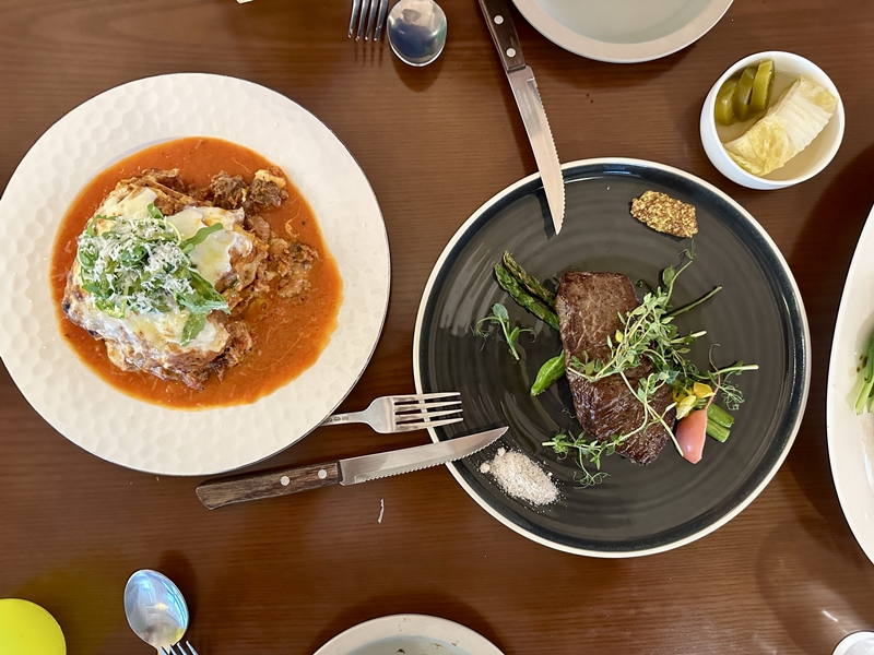 메인 메뉴인 라자냐와 한우 채끝 스테이크입니다.