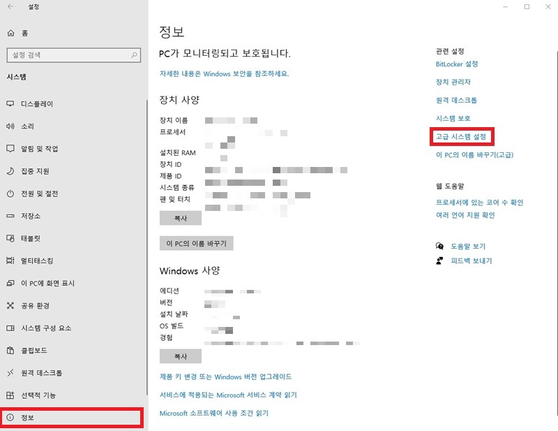 하단의 정보탭으로 들어간 다음, 우측에 있는 고급 시스템 설정으로 들어가 주세요.