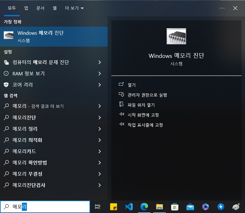 시작아이콘 옆의 검색창에 메모리를 입력하면 위에 실행 파일이 하나 뜨는데요.