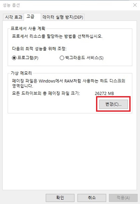 해당 메뉴에서 가상 메모리를 수동으로 할당할 수 있습니다.