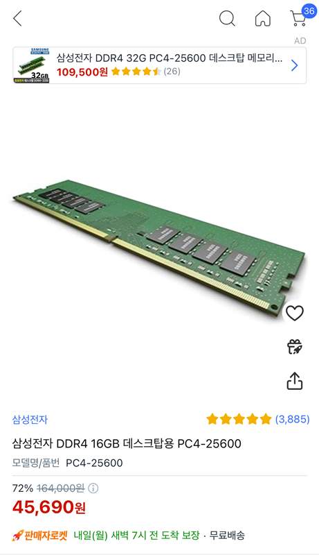 32기가 두 개는 너무 비싸서 가장 무난하고 평가가 좋은 삼성 메모리 16기가 두 개를 로켓배송으로 구매했습니다.