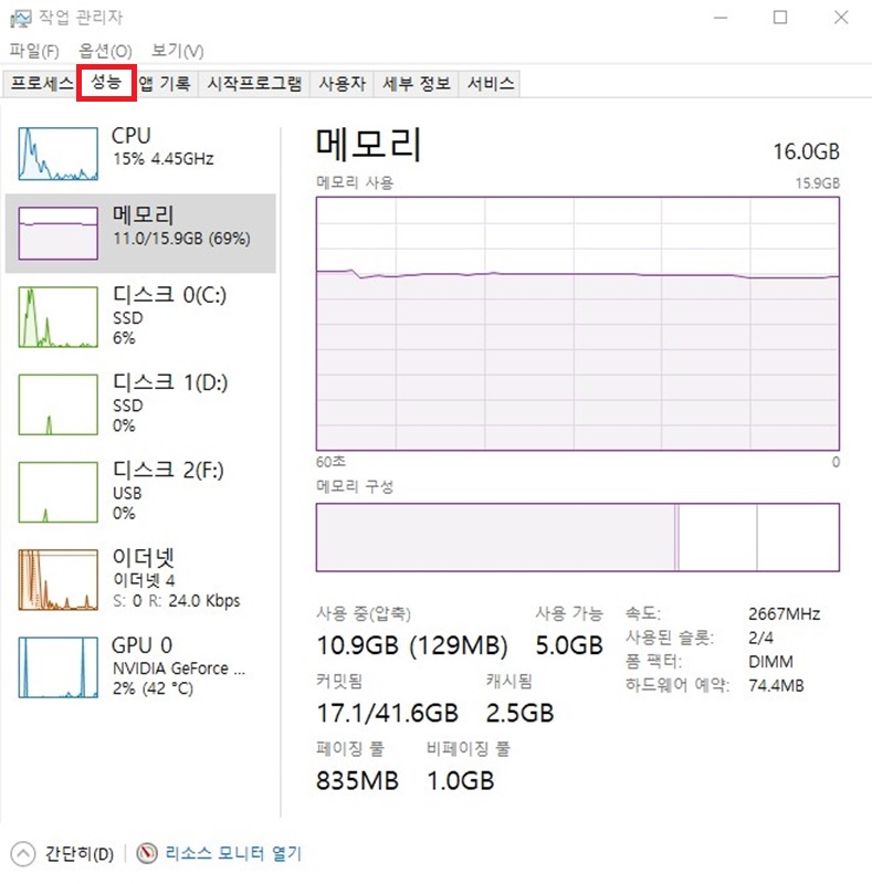 여기서 성능탭을 클릭하면 사진과 같은 화면이 나옵니다.