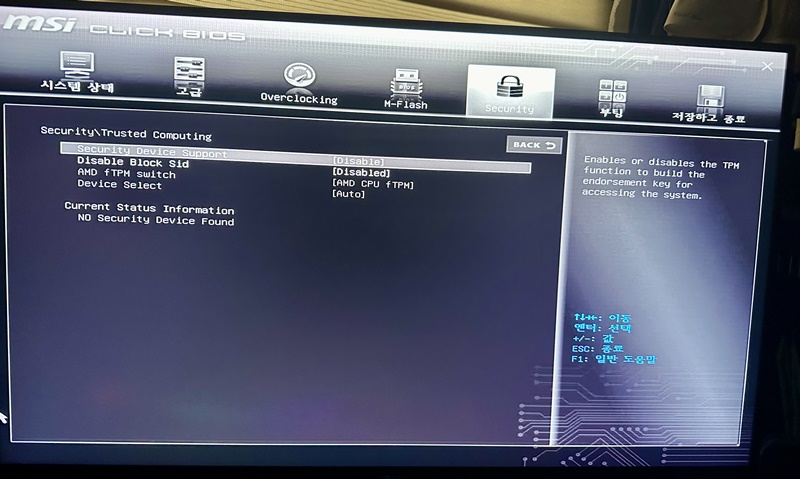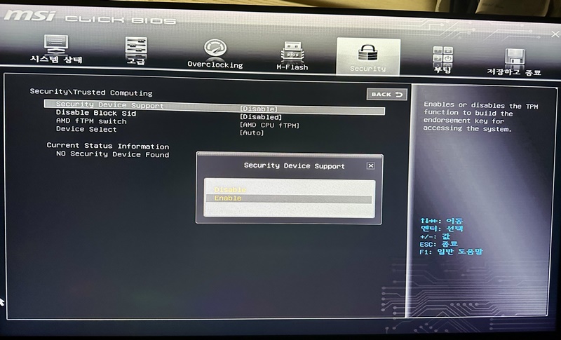 해당 메뉴에 들어가 보면 Security Device Support가 Disable로 되어 있습니다.
