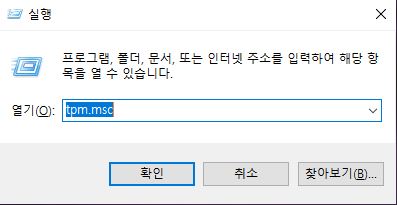 아까와 같이 윈도우키+R로 실행창을 여시고 tpm.msc를 입력 후 확인을 눌러 주세요.