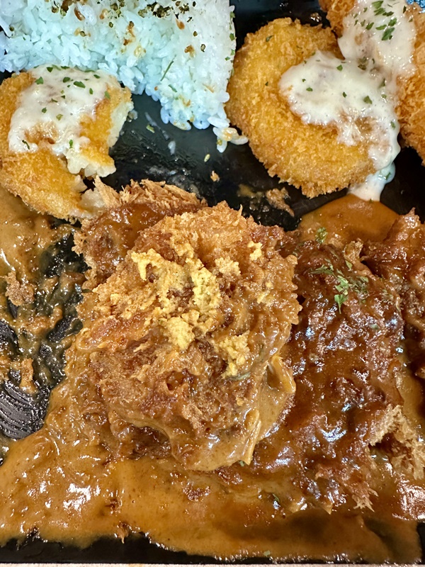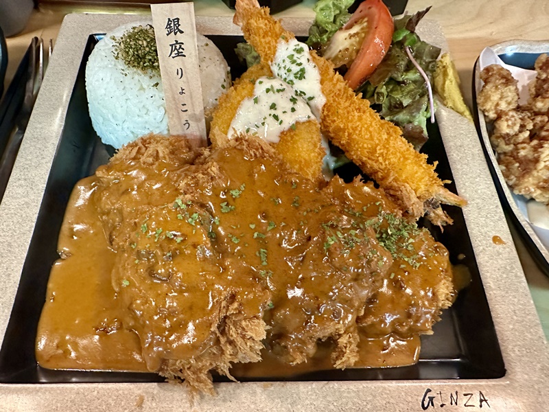 구성은 돈까스 세 장, 고로케 두 개, 새우튀김 하나, 샐러드, 밥입니다.
