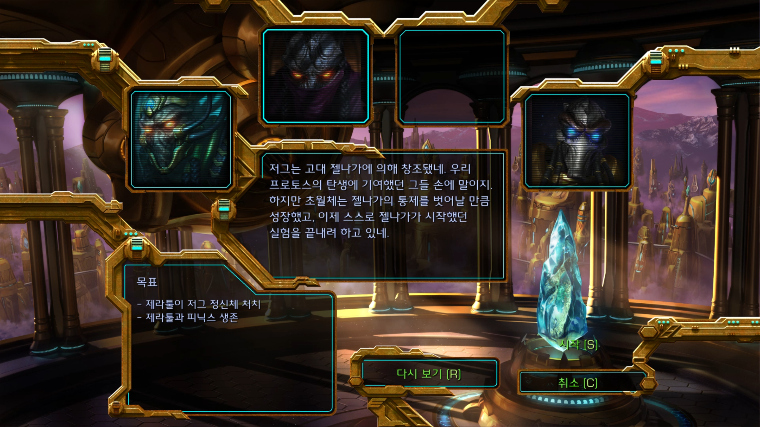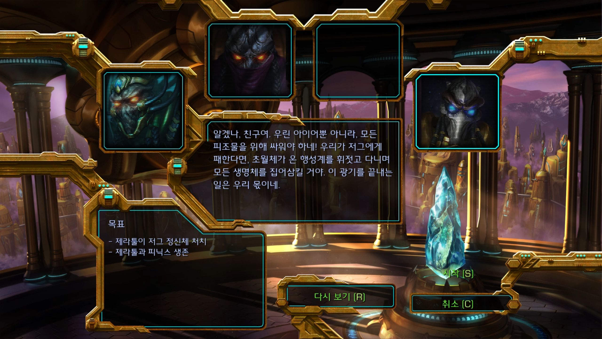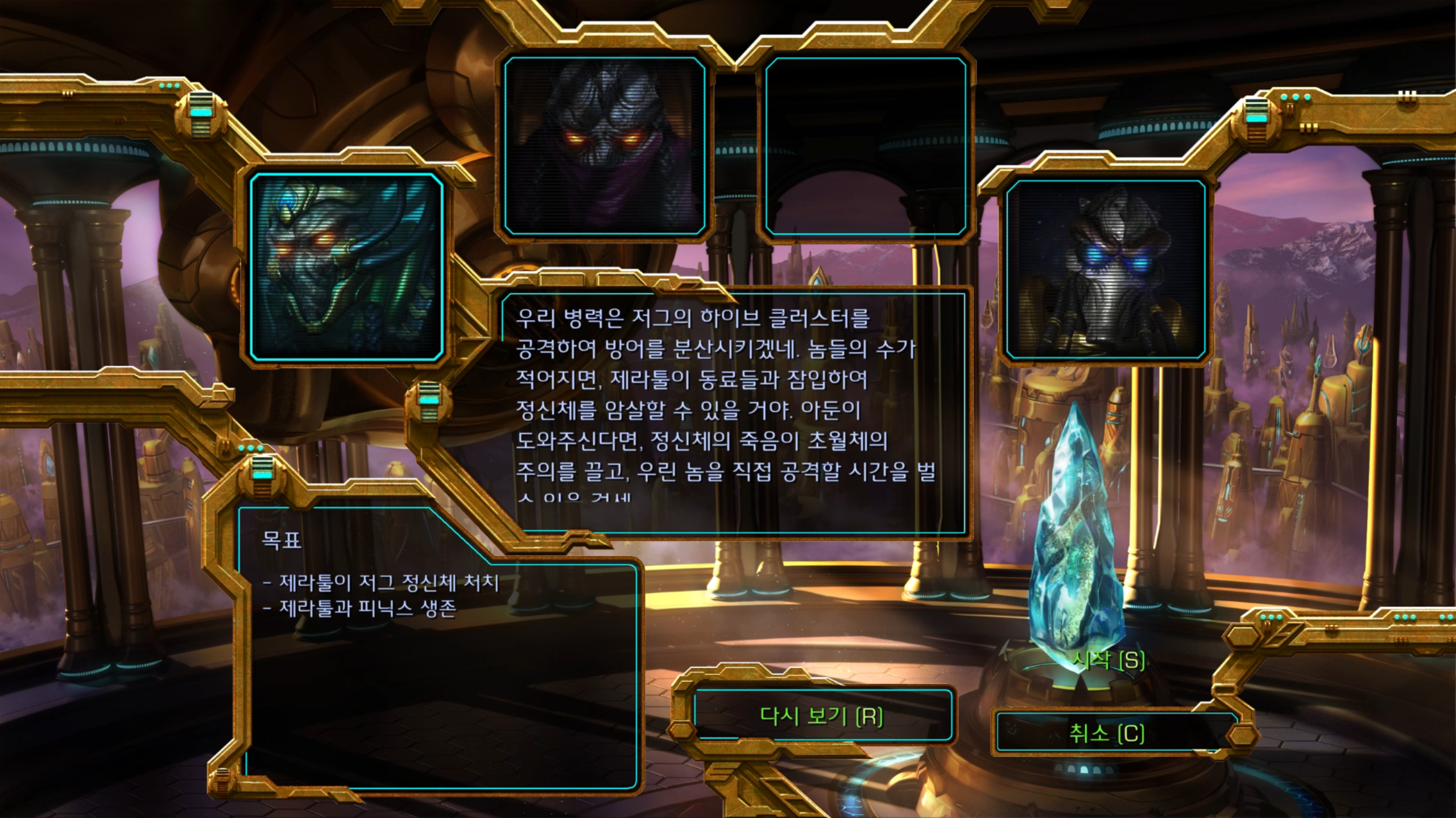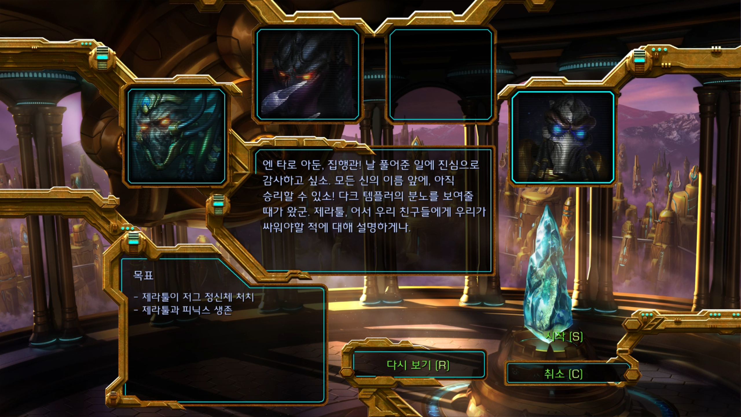 이번 미션부터는 아비터를 쓸 수 있습니다. 아비터는 상대로 만나면 굉장히 짜증나는 유닛이지만 저는 잘 안 쓰기 때문에.. 게다가 이번 상대가 저그라 은신 패시브도 그닥 유용하지가 않습니다.
