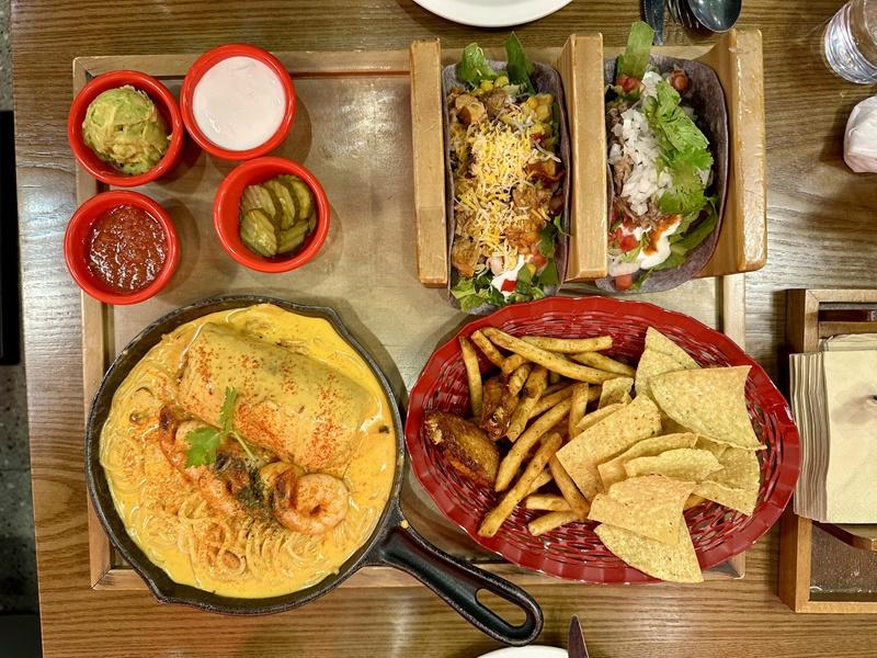 타코 두 개, 부리또가 들어간 파스타, 나초와 윙으로 구성되어 있습니다.