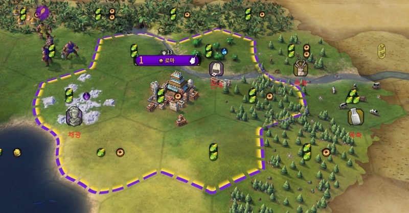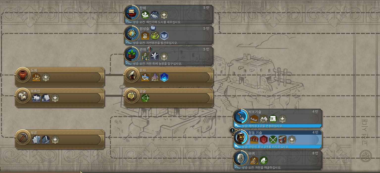 목축은 도시 영토가 좀 넓어져야 하고, 관개는 도예를 찍어야 하니까 저는 채광 찍겠습니다.