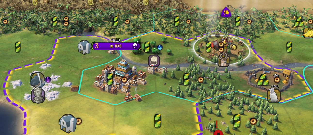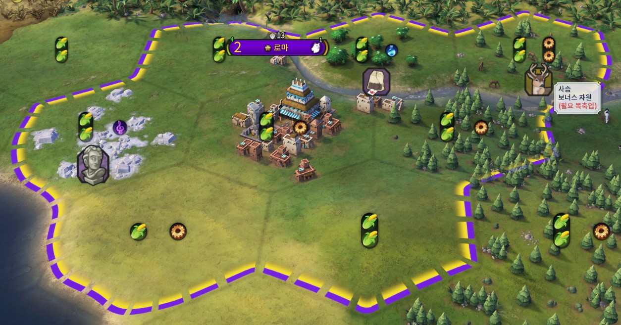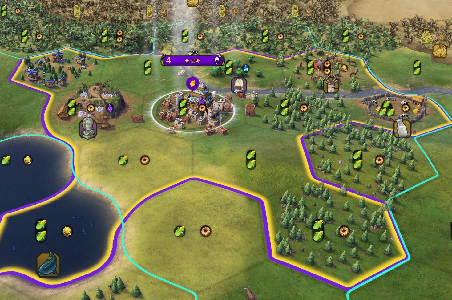 마찬가지로 식량 +2짜리 숲타일에 도시를 깔아서 생산력 +1이 추가되었습니다.