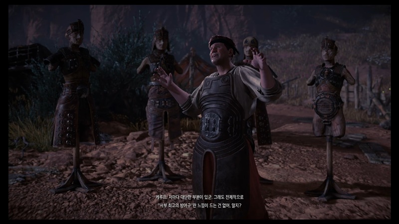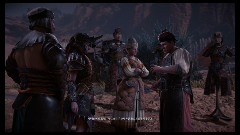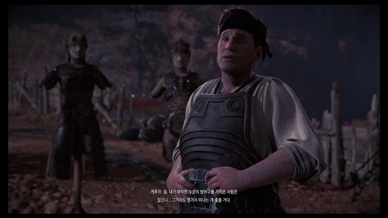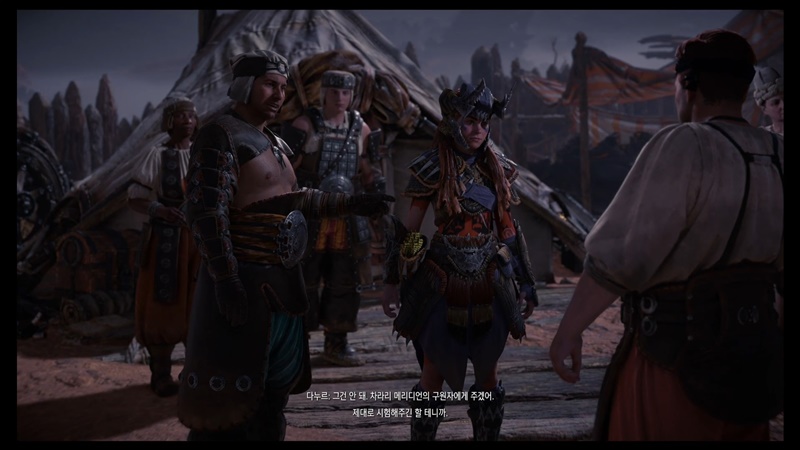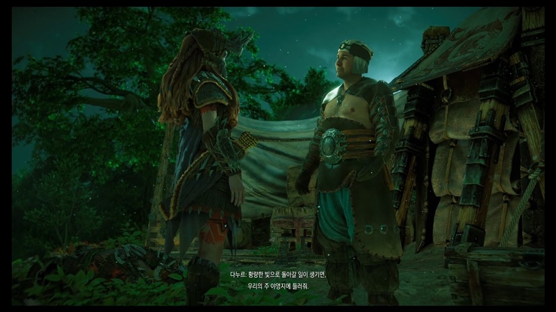 야영지에 가면 그동안 만났던 수확품 야영지의 대장들, 그리고 그 대장들에게 에일로이가 갖다 준 부품을 가지고 만든 방어구들이 있습니다.