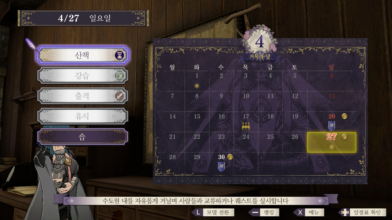 매주 일요일에는 산책, 강습, 출격, 휴식의 네 가지 중 하나를 골라서 일주일간 선택한 활동을 진행하는데 이 활동은 사실상 반 학생들의 육성이 목적입니다.