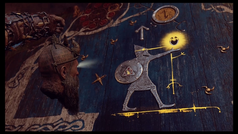 티르의 눈에 박혀있는 보석과 미미르의 눈이 반응하여 숨겨진 비밀 도면이 드러납니다.