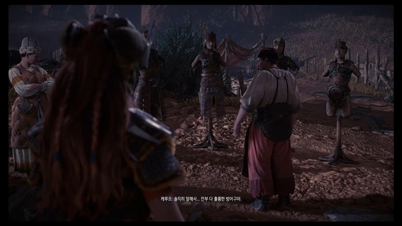 야영지에 가면 그동안 만났던 수확품 야영지의 대장들, 그리고 그 대장들에게 에일로이가 갖다 준 부품을 가지고 만든 방어구들이 있습니다.